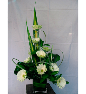 Diseño elaborado en gerberas, cintillas, pandamos, hoja de dracena, ruscos, base de vidrio. Tamaño foto – Pequeño $120.000