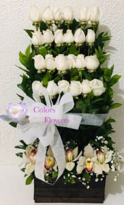 Diseño elaborado con rosas x 24, orquidea cymbidium, gipsophilia, rusco, moño cinta acuarela, base de madera. Color de rosas predilecto.